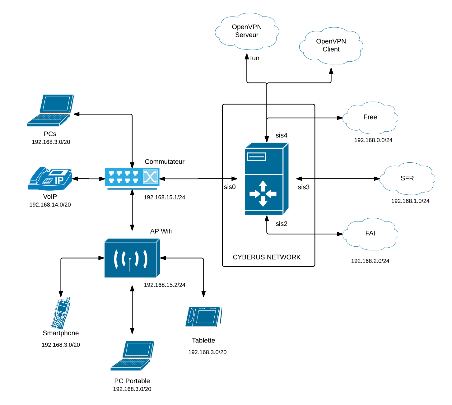 Le choix d’OpenBSD comme système d’exploitation est motivé par le besoin exprimé par le client d’avoir une solution robuste et fiable, peu consommatrice en ressource système. Réputé sûr et performant, économe et avant tout pensé pour la gestion du réseau, OpenBSD a retenu toute notre attention pour ce projet.